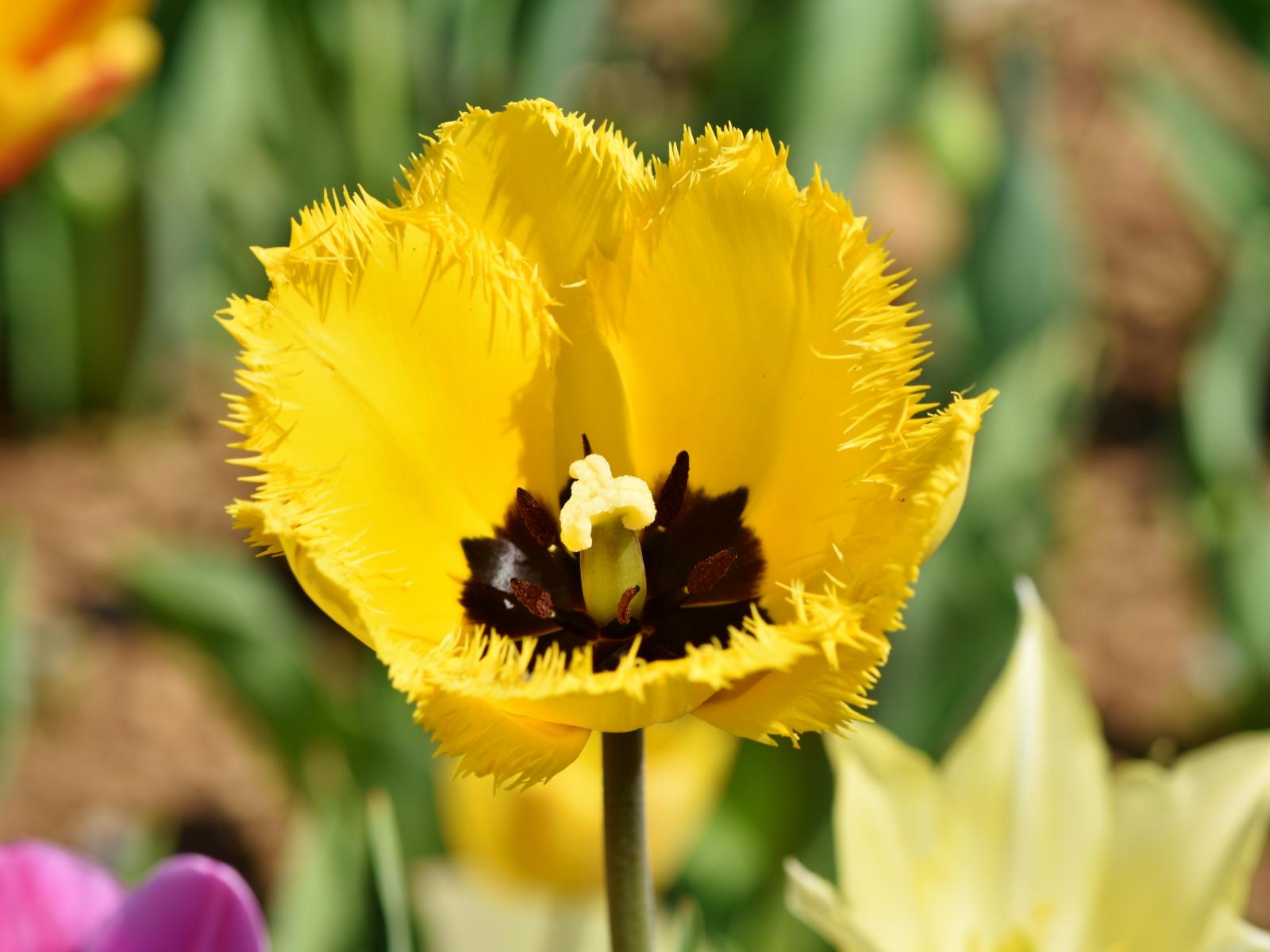 Wallpaper Red tulip and yellow buttercups on the flowerbed