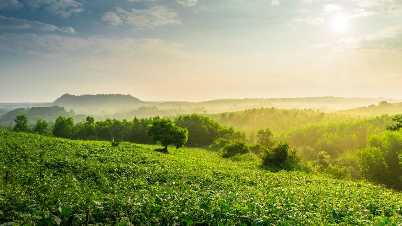 Wallpaper Mist enveloped the green thickets of the forest at dawn
