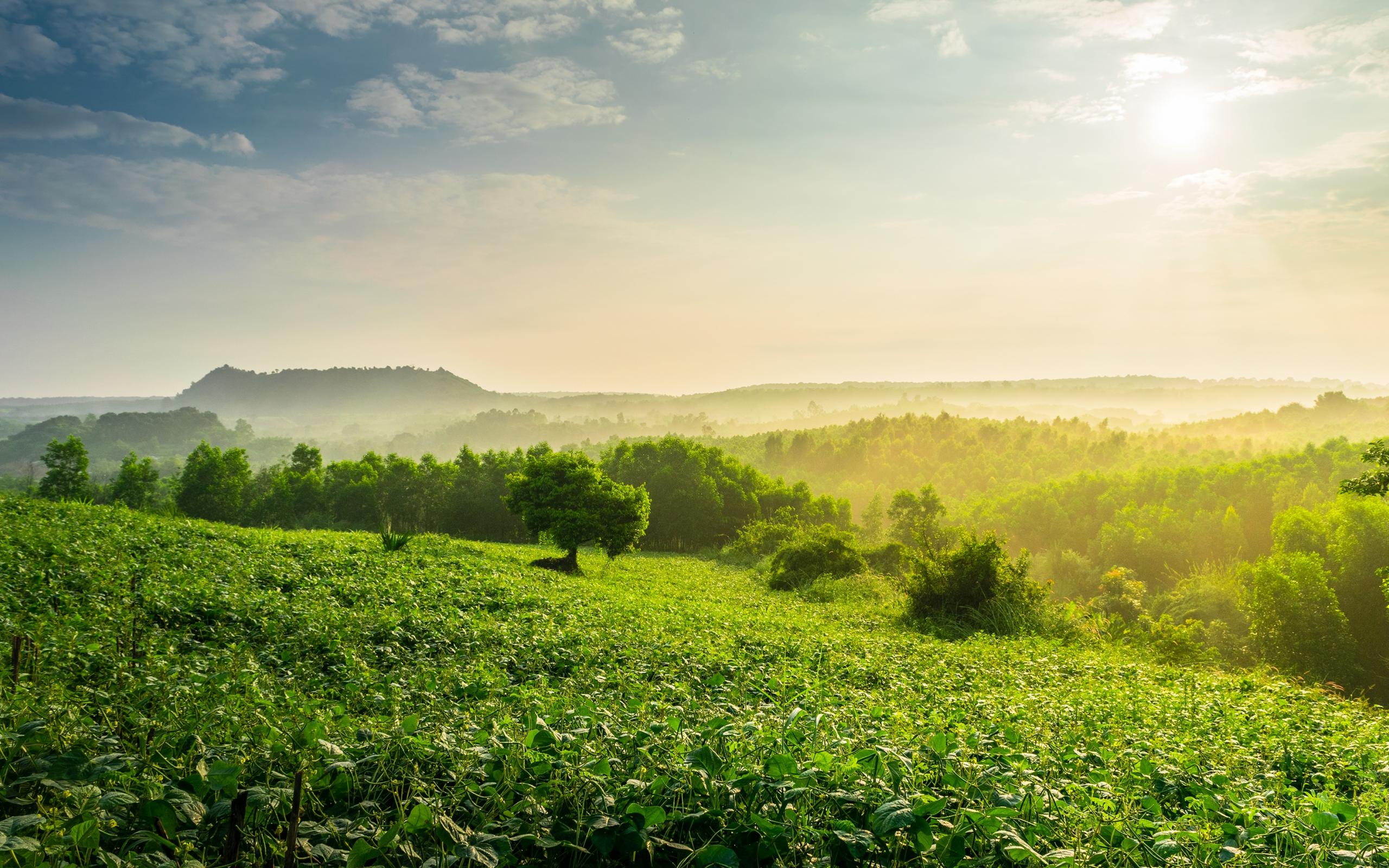 Wallpaper Mist enveloped the green thickets of the forest at dawn
