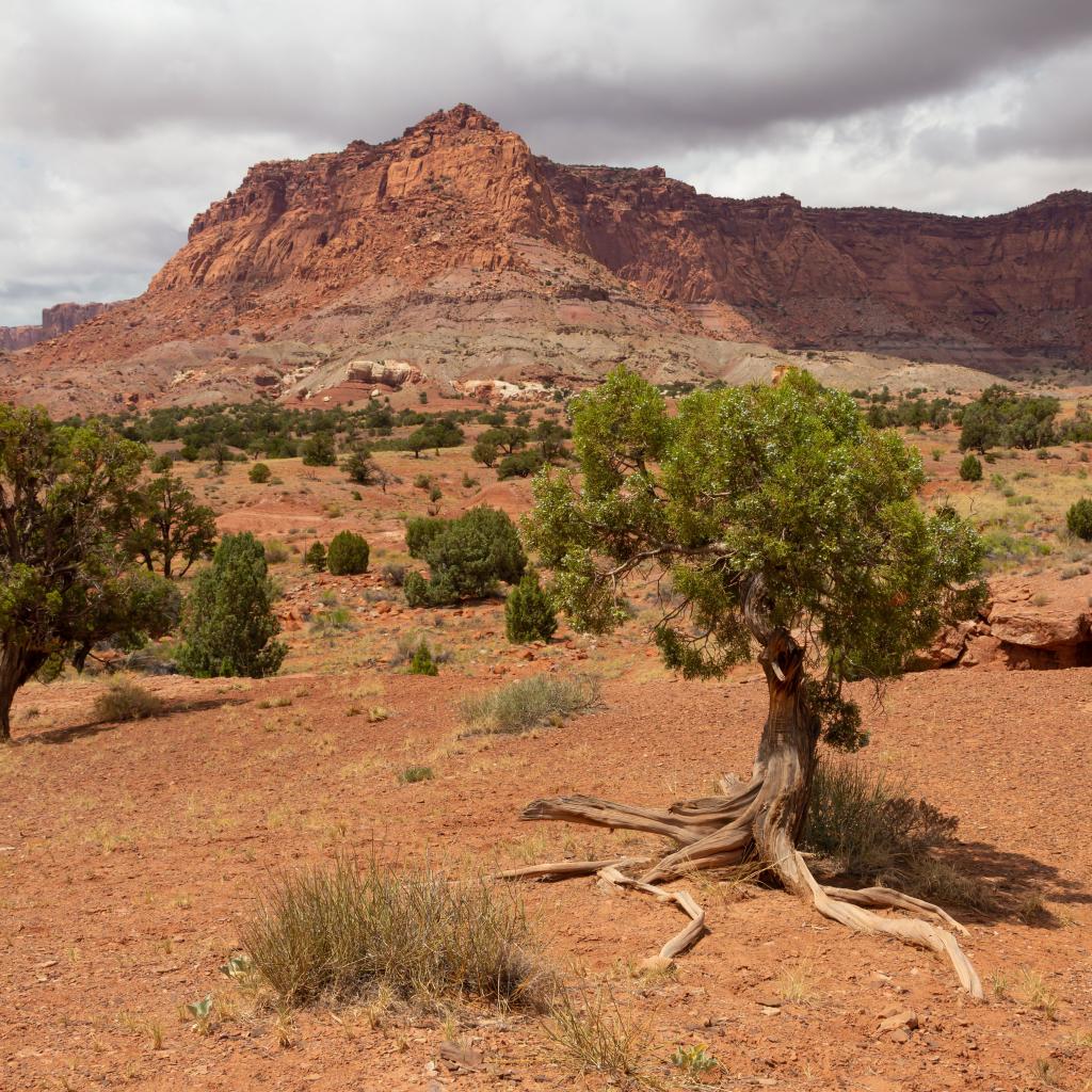 Wallpaper Trees grow on dry ground with mountains in the background