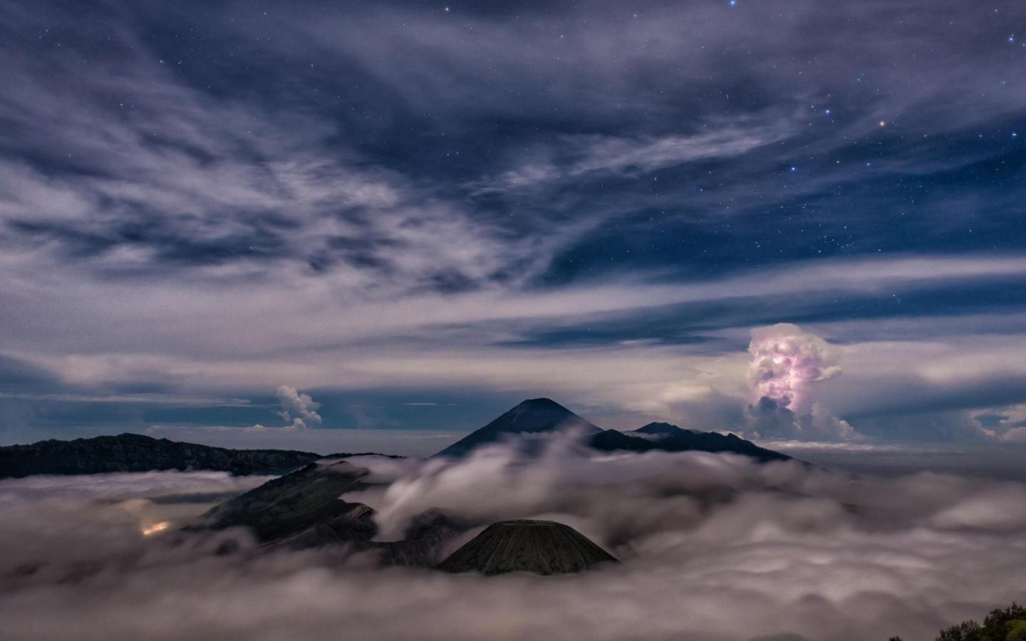 Wallpaper Starry sky above the clouds and fog in the mountains