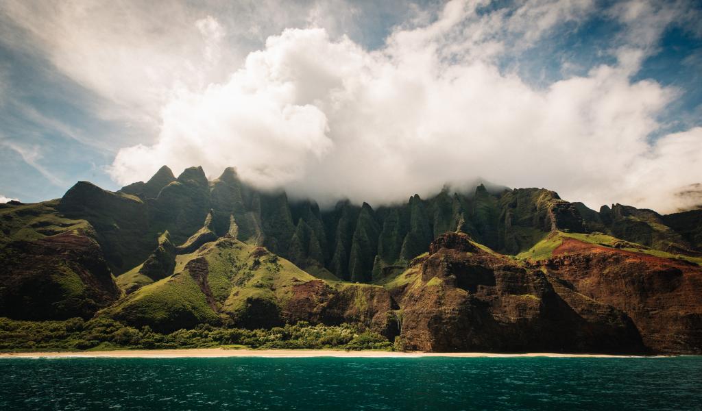 Wallpaper White clouds envelop the top of the mountain near the lake.