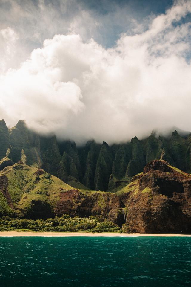 Wallpaper White clouds envelop the top of the mountain near the lake.
