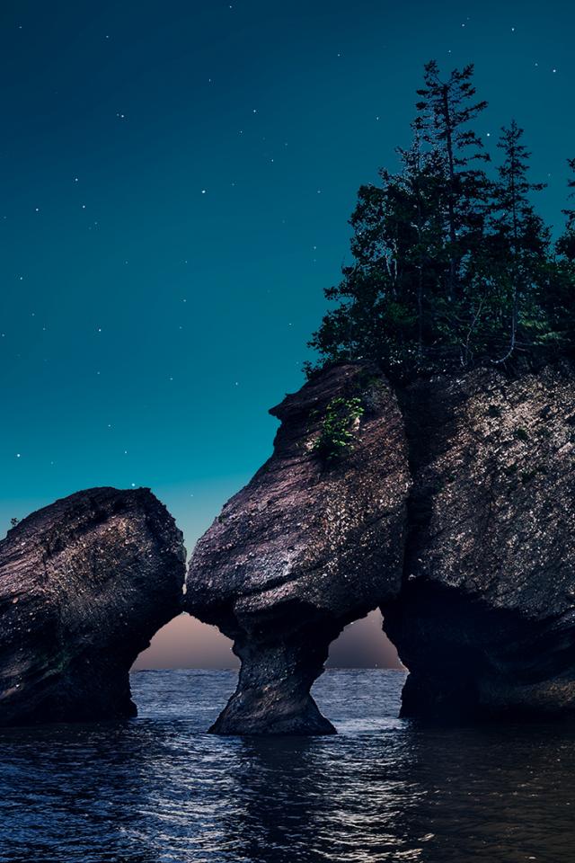 Wallpaper Rocks with trees in the water at night