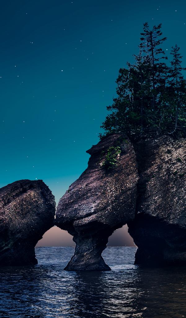 Wallpaper Rocks with trees in the water at night