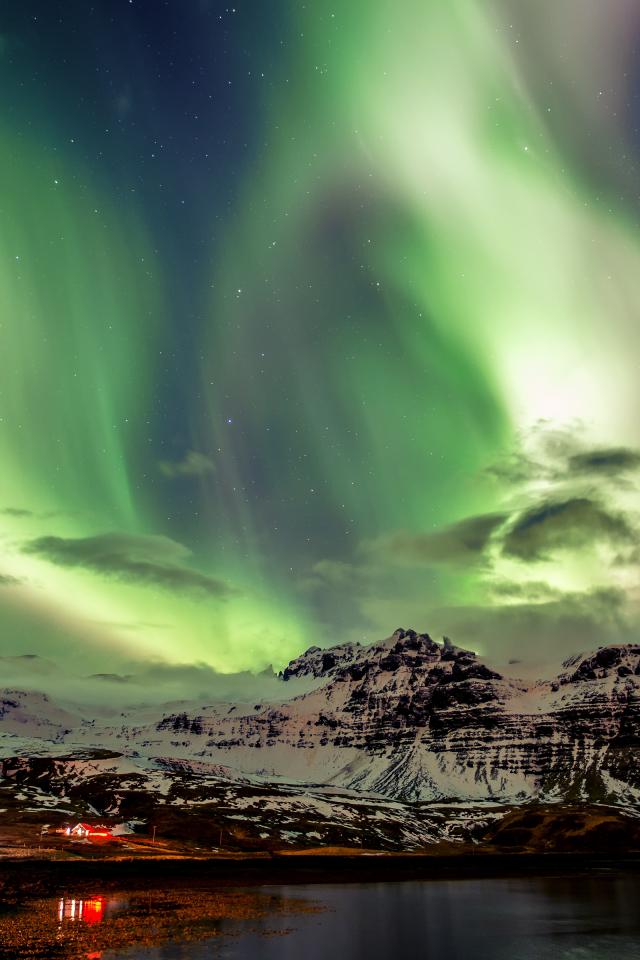 Wallpaper Northern lights over snowy mountains, Iceland