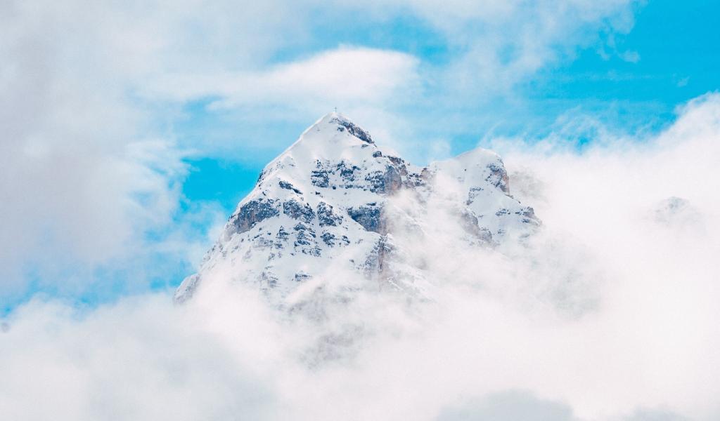Wallpaper Snow-capped mountain peak in white clouds under blue sky