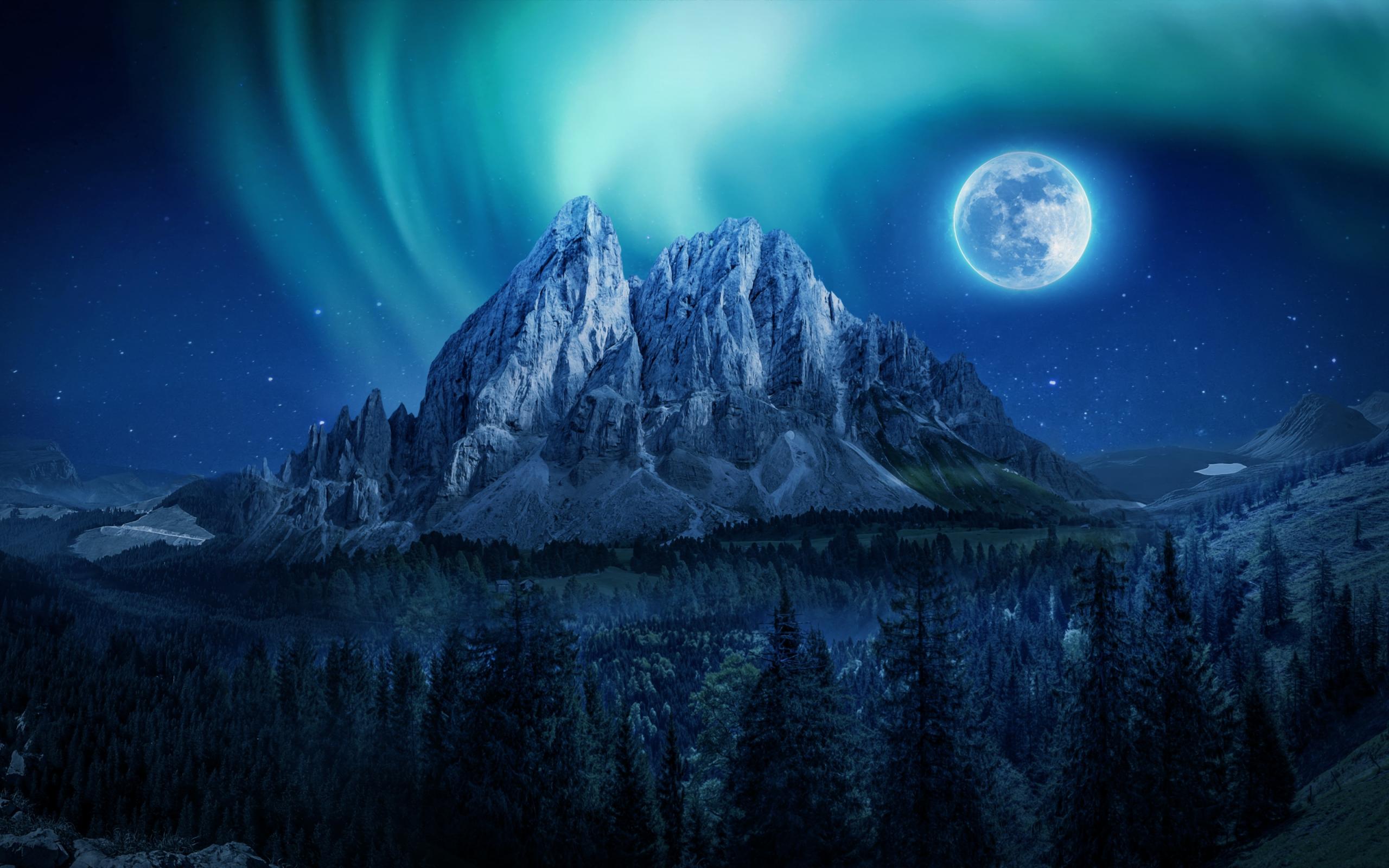 Wallpaper Bright moon over the mountains near the forest in the sky