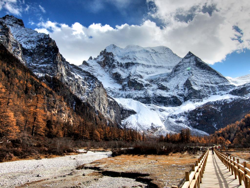 Wallpaper A bridge at the foot of snowy majestic mountains