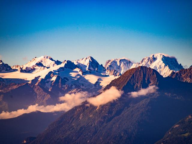 Wallpaper Snow-capped mountain peaks under a blue sky