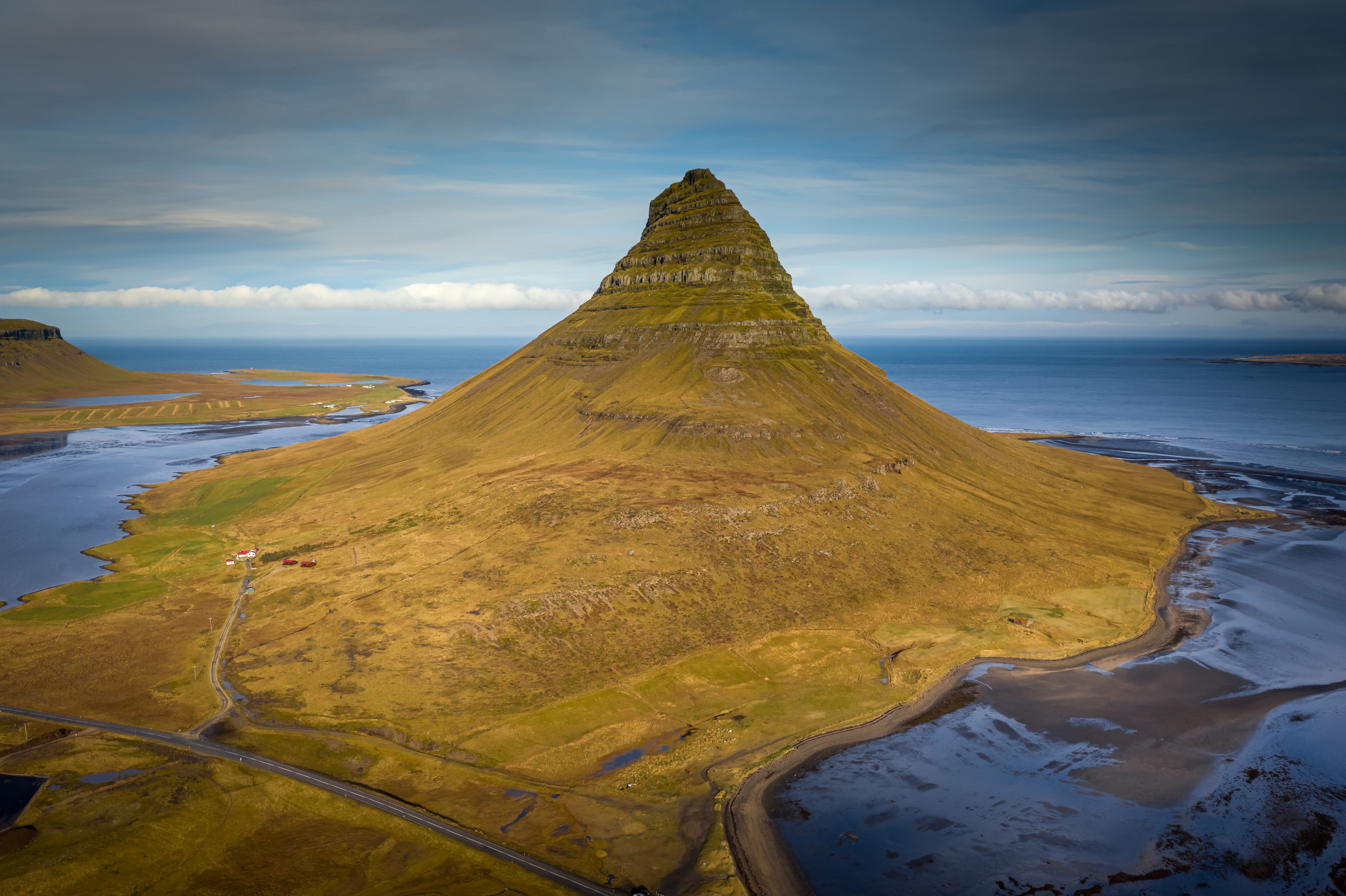 Wallpaper Green Mountain Kirkufettle under a blue sky, Iceland