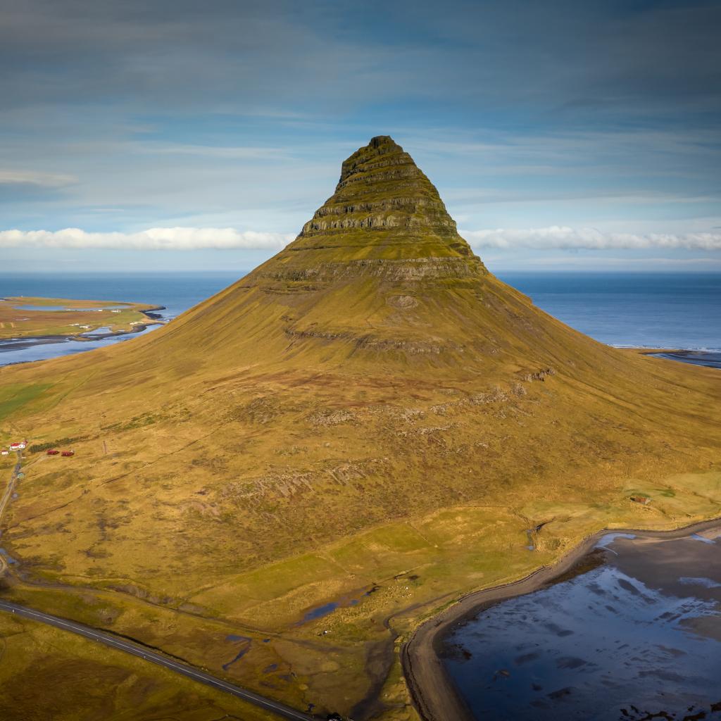 Wallpaper Green Mountain Kirkufettle under a blue sky, Iceland