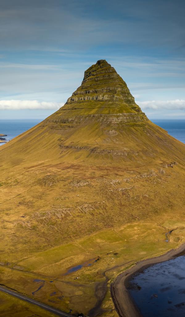 Wallpaper Green Mountain Kirkufettle under a blue sky, Iceland
