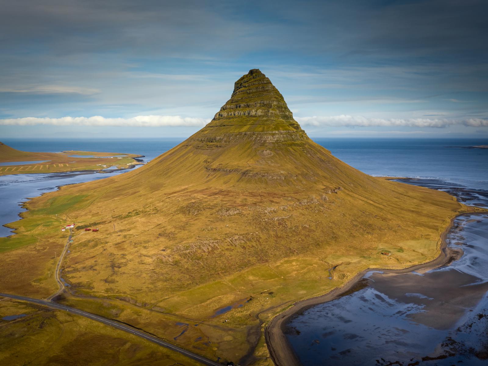 Wallpaper Green Mountain Kirkufettle under a blue sky, Iceland