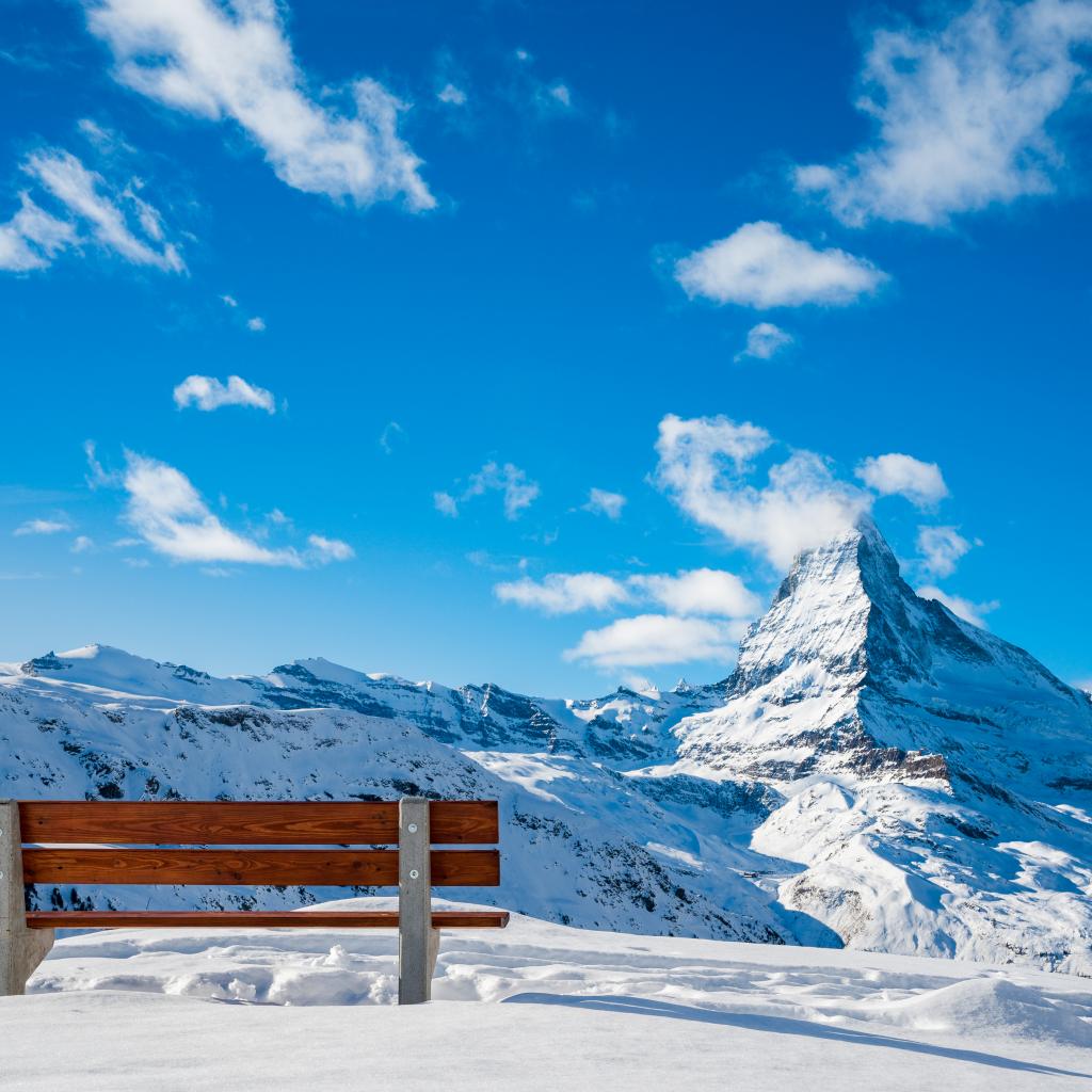 Wallpaper Bench in the snowy mountains under a blue clear sky