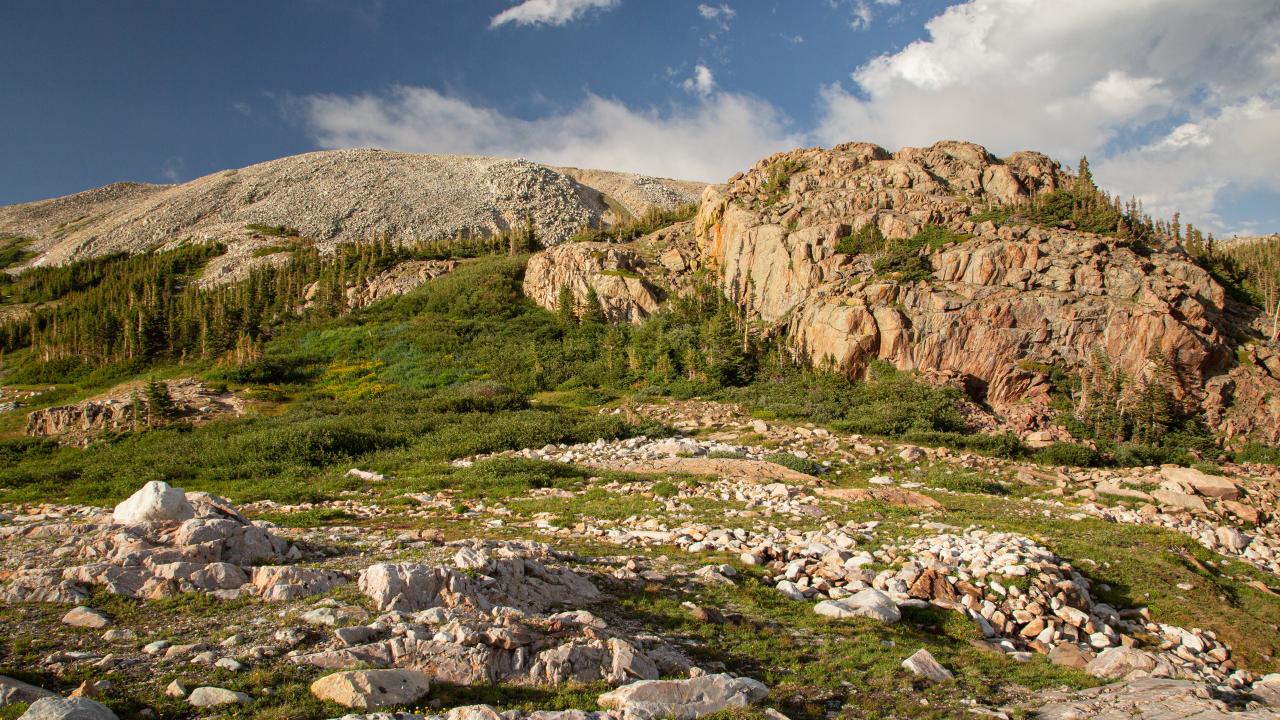 Wallpaper High stone mountains under blue sky with white clouds