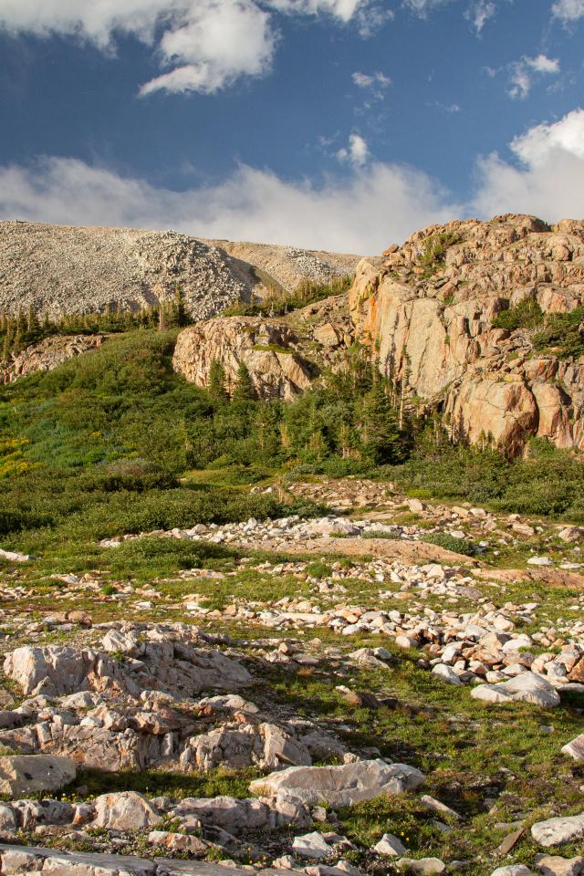 Wallpaper High stone mountains under blue sky with white clouds