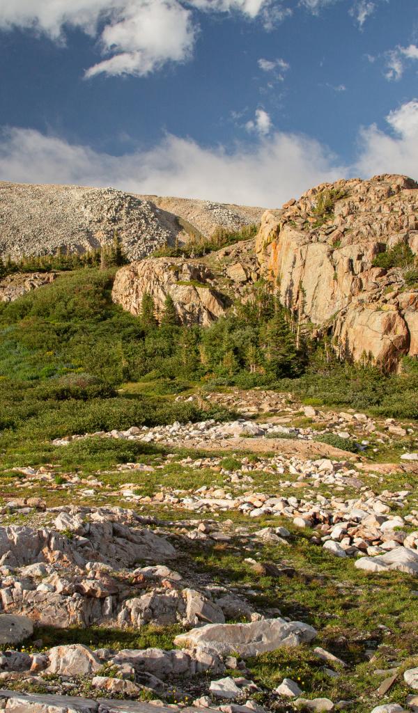 Wallpaper High stone mountains under blue sky with white clouds