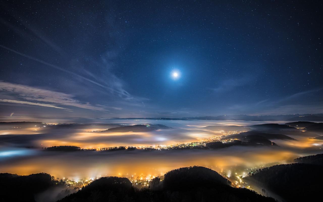 Wallpaper View from the mountain to the fog-covered night city