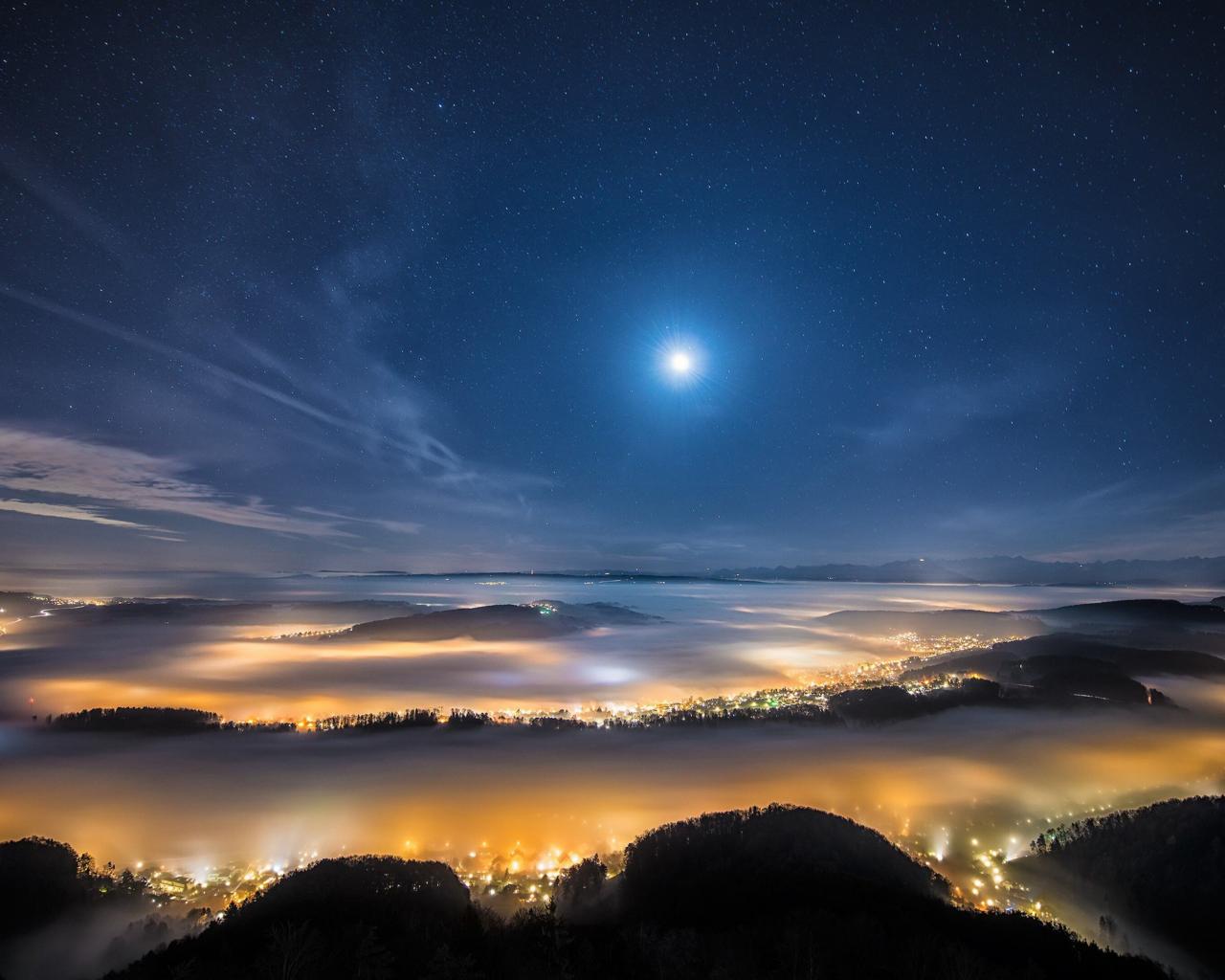 Wallpaper View from the mountain to the fog-covered night city
