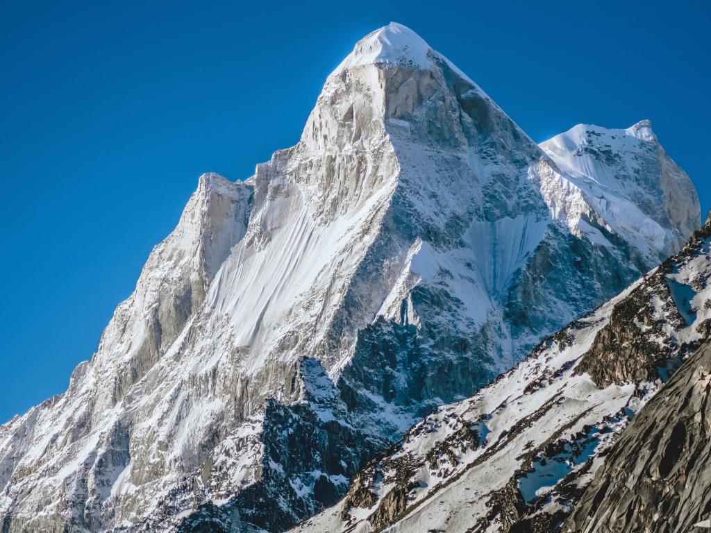 Wallpaper The sharp peak of the snowy mountain under the blue sky