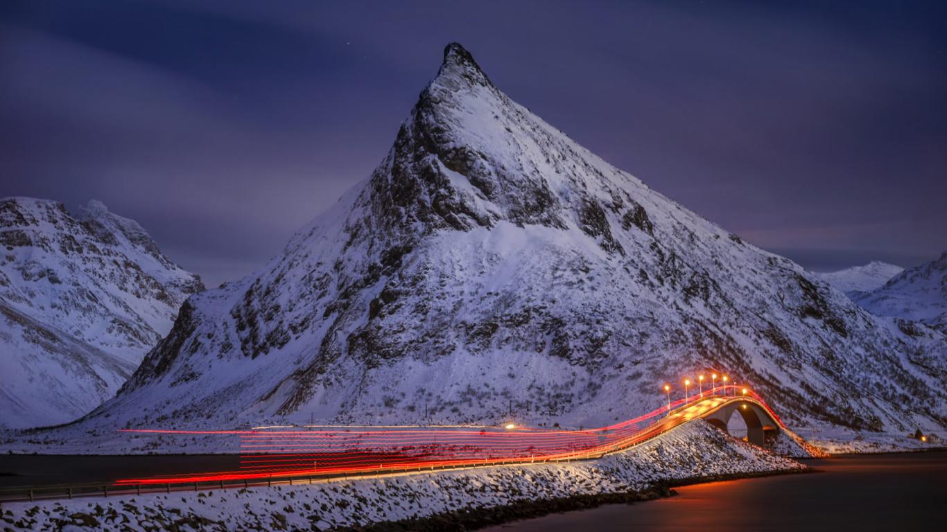 Wallpaper Night road by snowy mountains