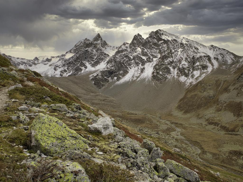 Wallpaper Dry river in the mountains under a stormy sky