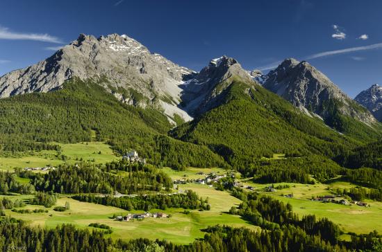Wallpaper High Swiss Alps are covered with greenery under a blue sky