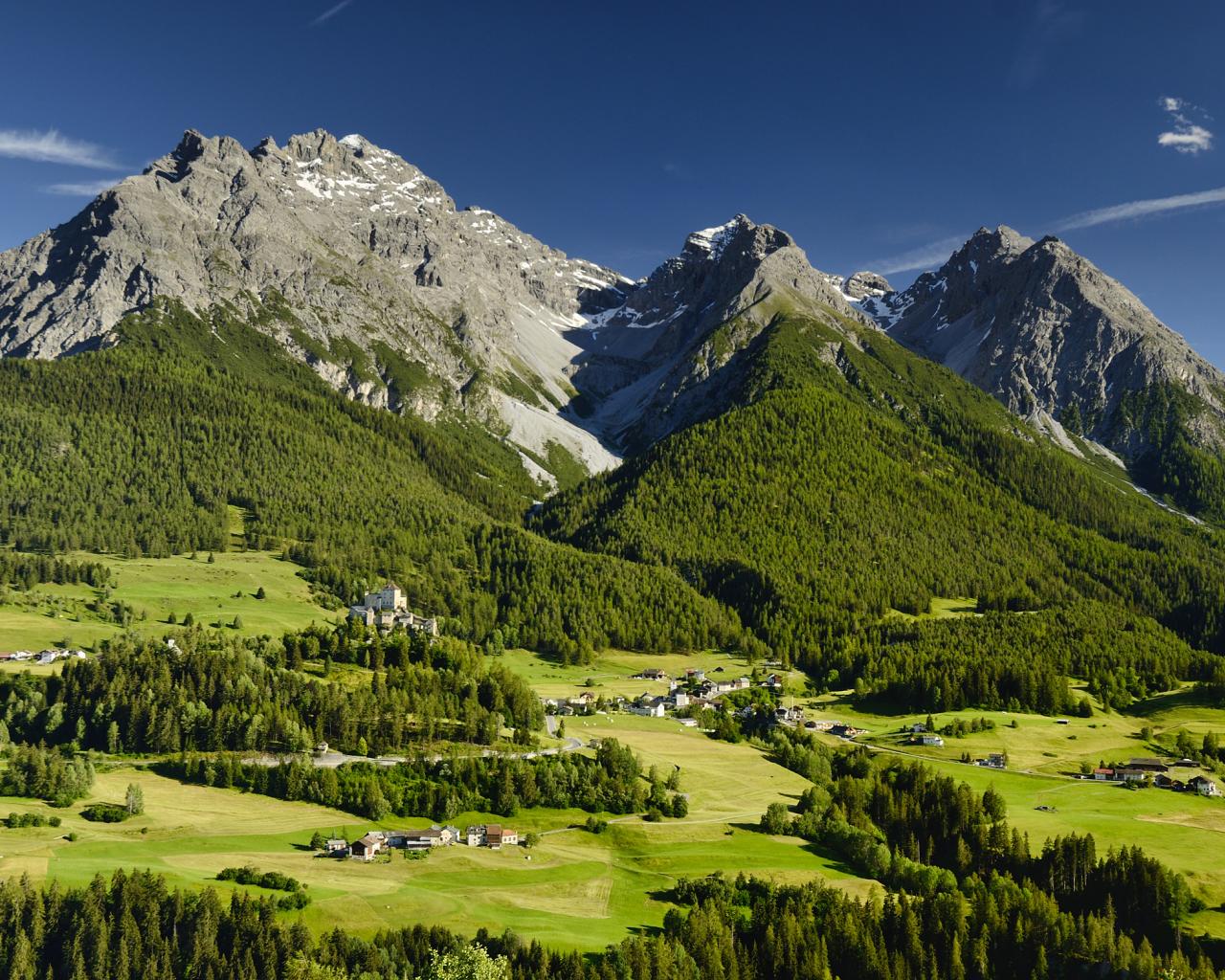 Wallpaper High Swiss Alps are covered with greenery under a blue sky