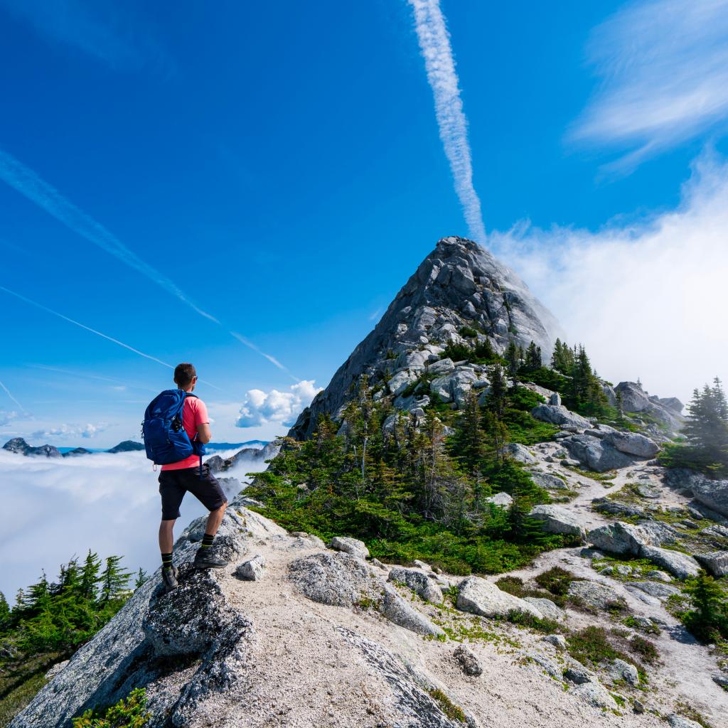 Wallpaper A man climbs to the top of a mountain under a blue sky