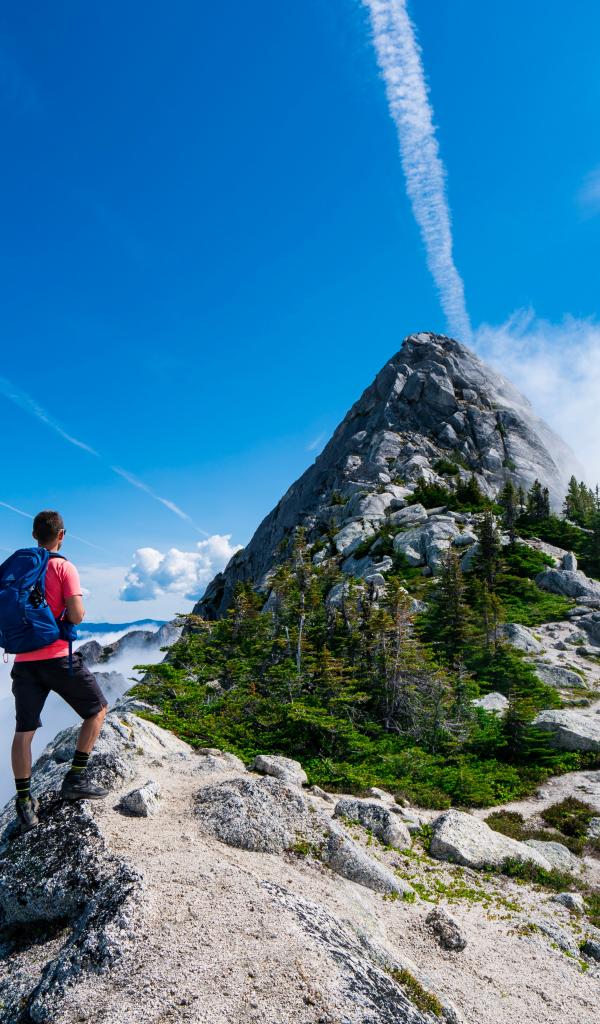 Wallpaper A man climbs to the top of a mountain under a blue sky