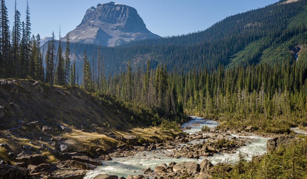 Wallpaper The mountain is covered with coniferous forest by the river