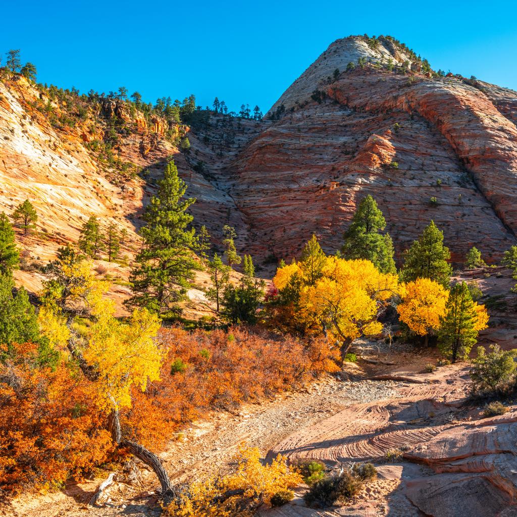 Wallpaper Mountains with trees in the rays of the bright autumn sun