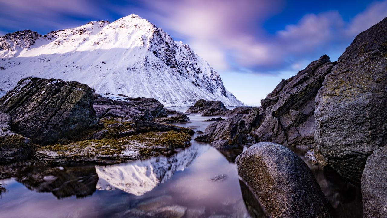 Wallpaper Snow-capped mountains by a stream under a beautiful sky