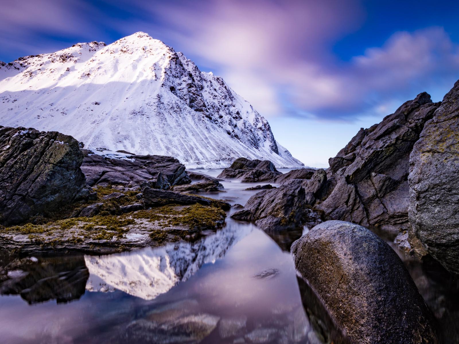Wallpaper Snow-capped mountains by a stream under a beautiful sky
