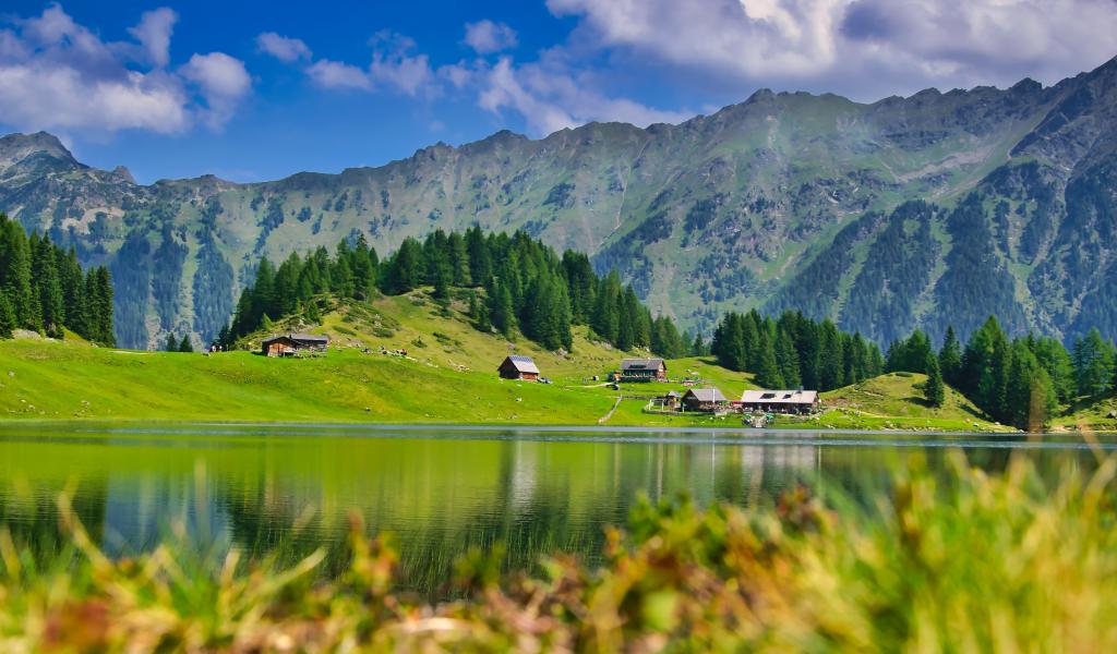 Wallpaper Beautiful landscape of mountains and lake and green meadows