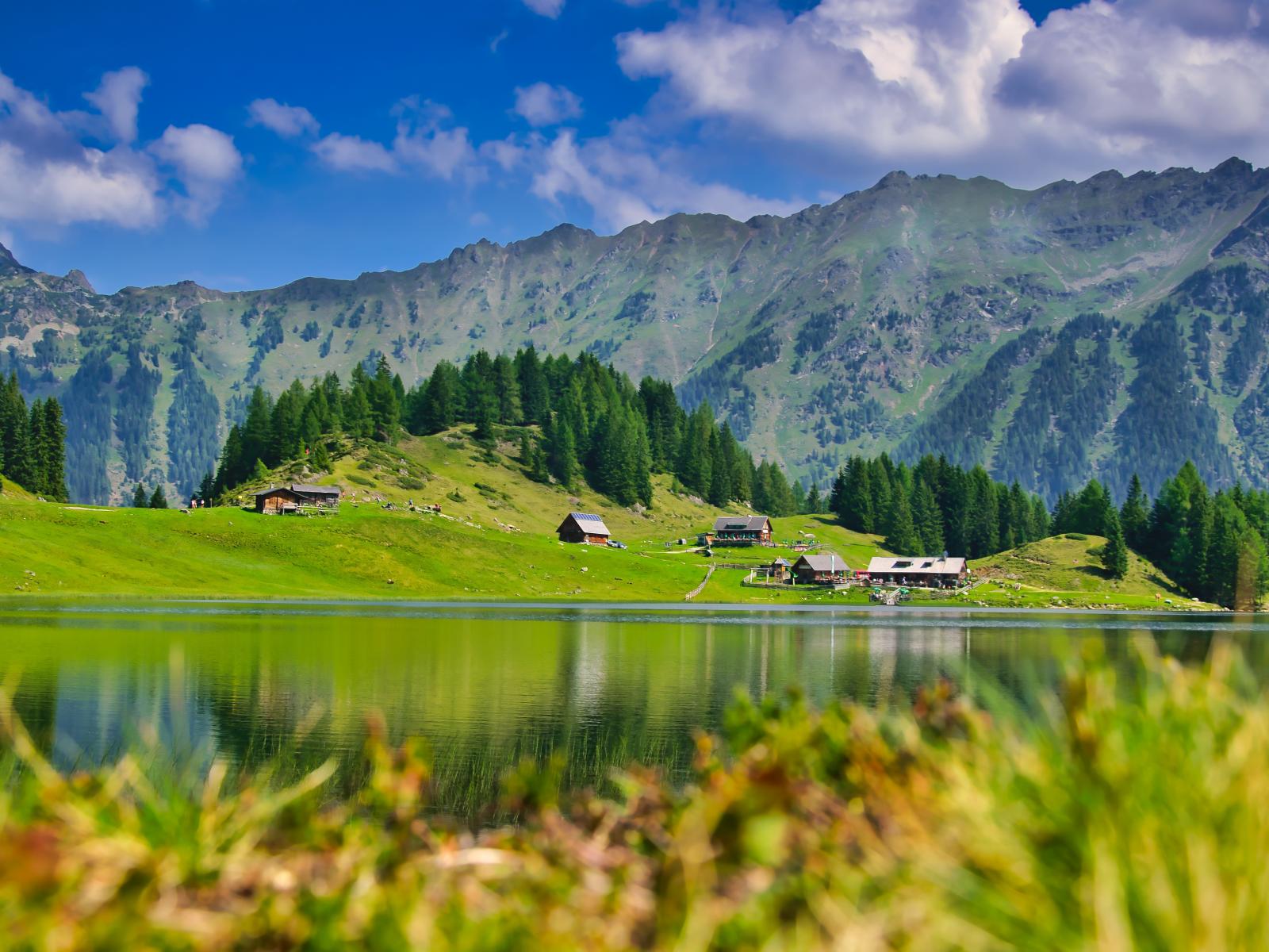 Wallpaper Beautiful landscape of mountains and lake and green meadows