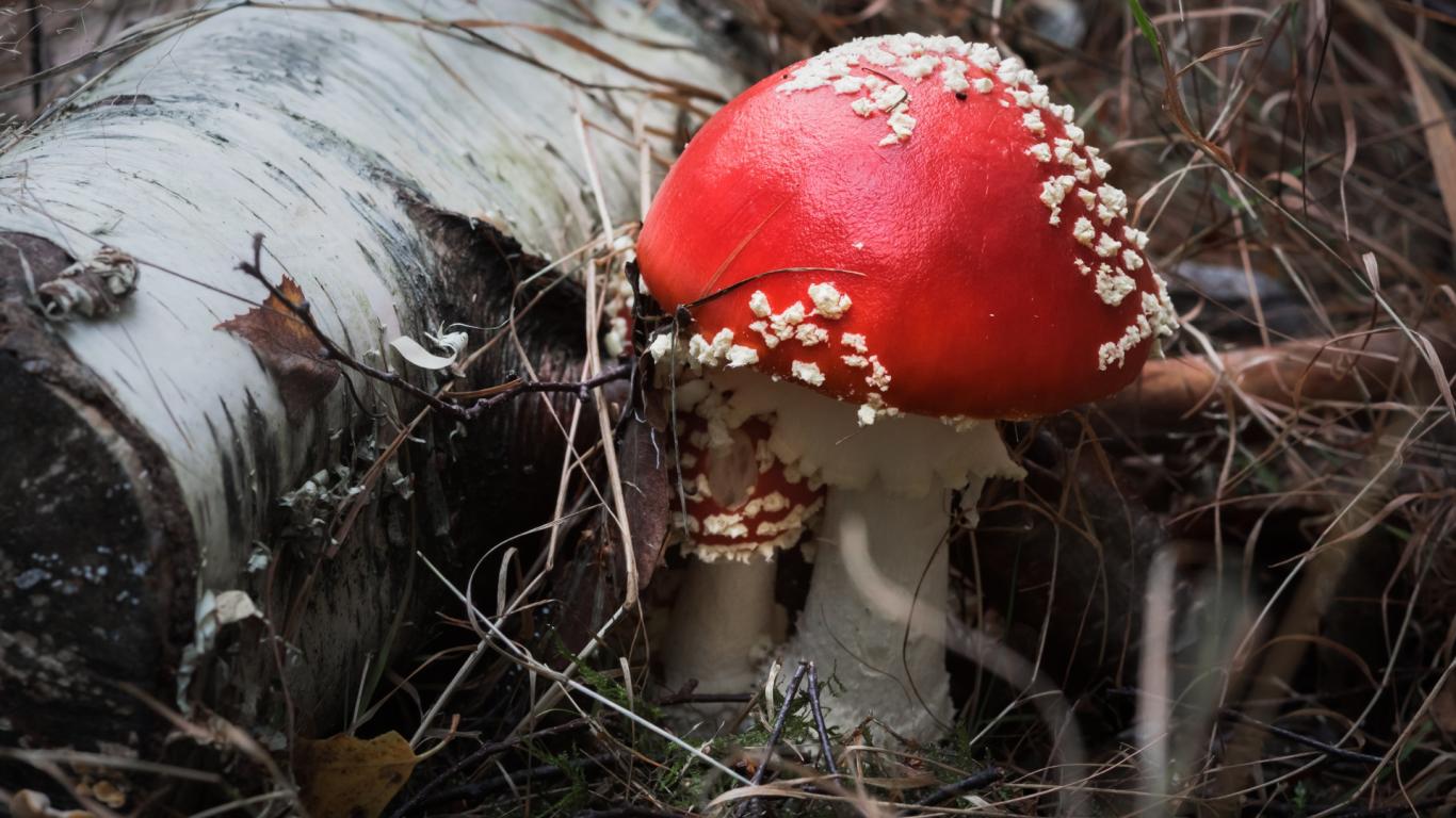 Wallpaper Beautiful fly agaric mushroom with a red hat in a dry birch