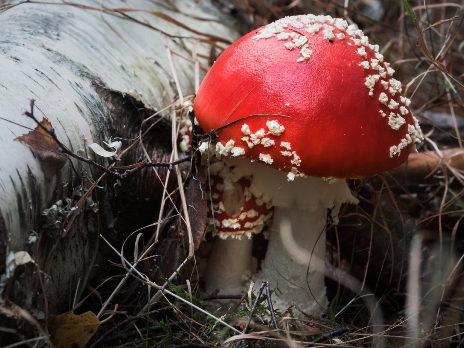 Wallpaper Beautiful fly agaric mushroom with a red hat in a dry birch