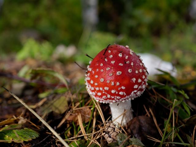 Wallpaper Red mushroom Amanita in the grass in autumn