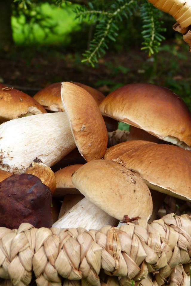 Wallpaper A basket of mushrooms stands on the grass in the forest