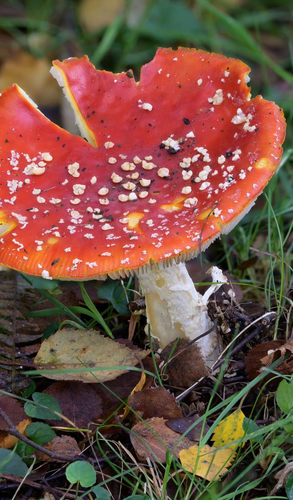 Wallpaper Red fly agaric on the ground with fallen leaves and grass