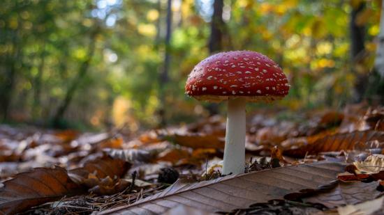 Wallpaper Amanita muscaria grows in the forest on dry leaves