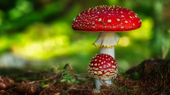 Wallpaper Two red bright amanita grow on the ground in the forest