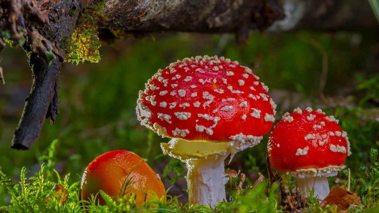 » Wallpaper Three red fly agaric under a snag