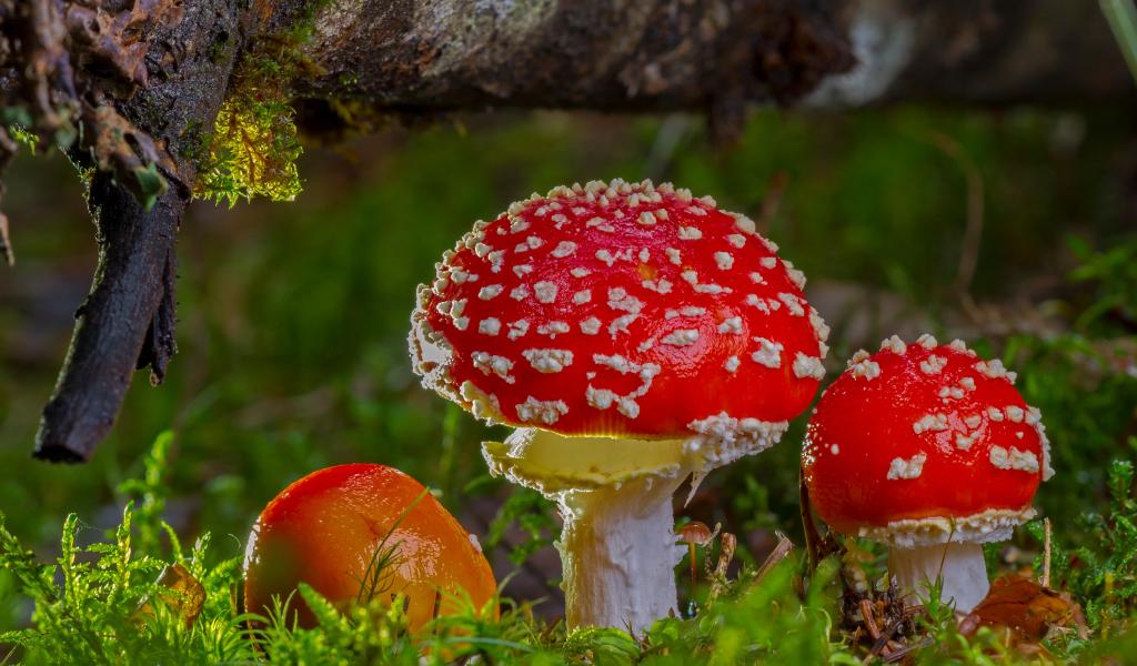 » Wallpaper Three red fly agaric under a snag