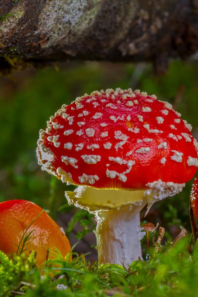 Wallpaper Three red fly agaric under a snag