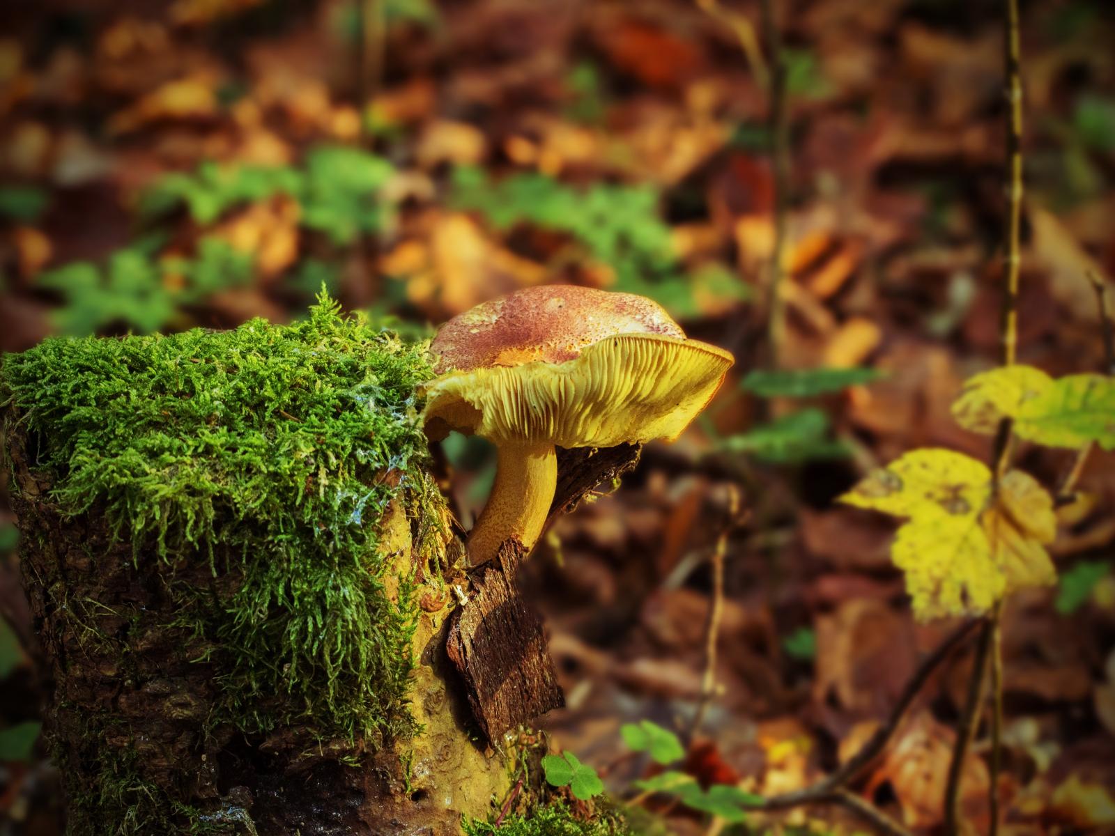 Wallpaper A wild mushroom grows on a moss-covered tree stump