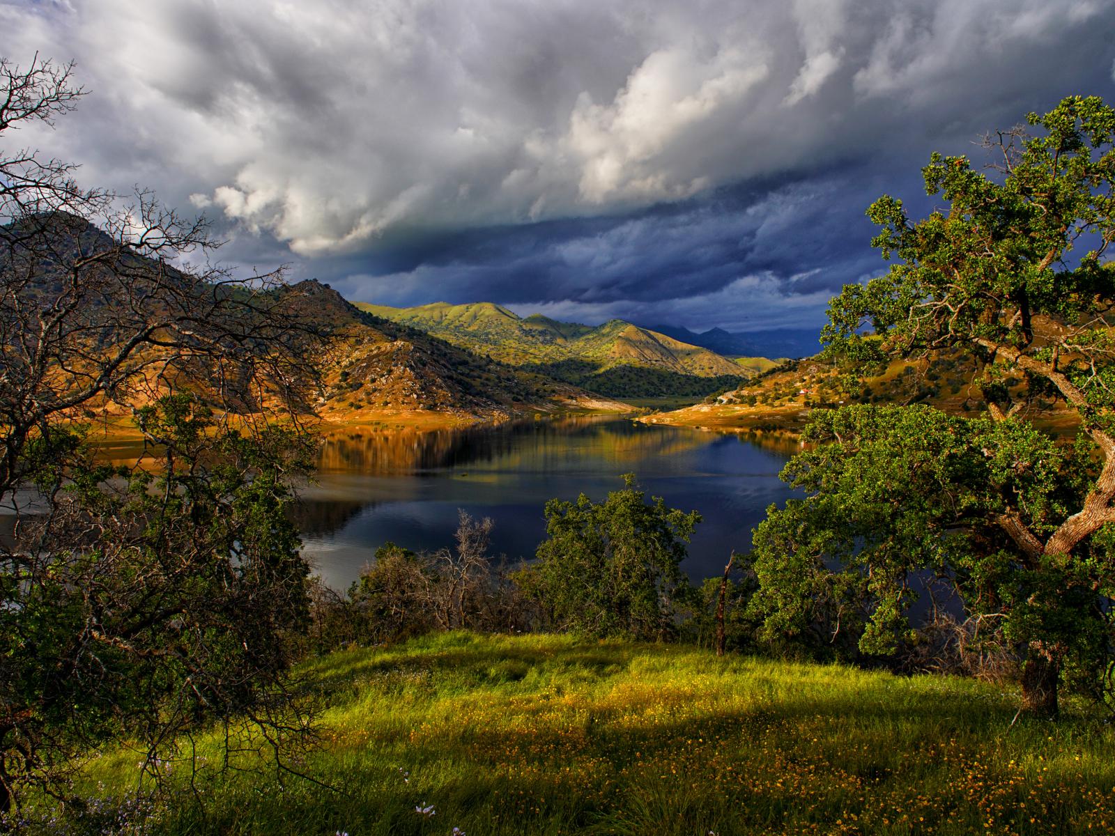 Wallpaper Black thunderclouds over a lake in the mountains