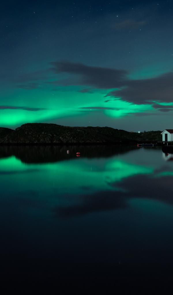 Wallpaper Houses by the lake against the background of the polar lights